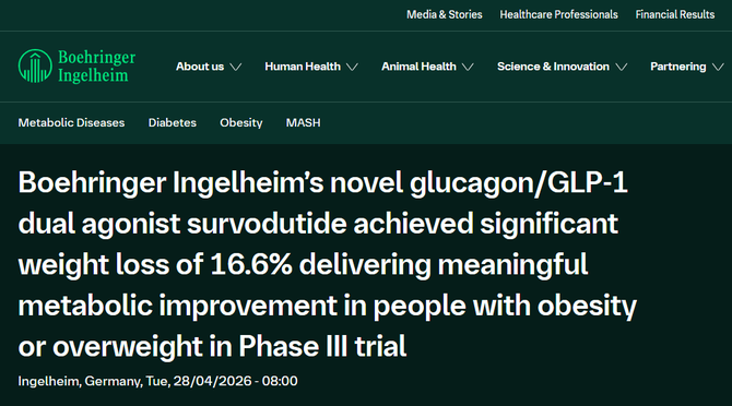현지시간으로 지난 28일 오전 베링거인겔하임은 공식 홈페이지를 통해 "자사의 글루카곤(Glucagon) 및 GLP-1 수용체 이중 작용제인 서보두타이드의 글로벌 임상 3상 'SYNCHRONIZE-1'에서 긍정적인 탑라인(Top-line) 결과를 도출했다"고 발표했다.