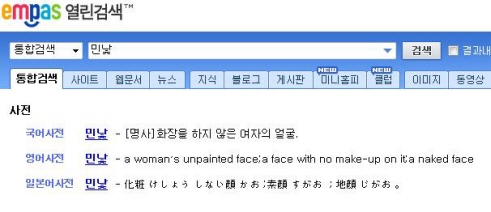 엠파스 사전에 따르면 민낯은 생소하나 표준어다. 그러나 쌩얼은 공식적으로는 사용하는 게 문제가 되는 '속어'다. 구 민주당 유종필 대변인 등 재치있는 일부 정치인이 논평에서도 인용하는 등 일반적으로는 사용되고 있으나, 분명히 교정 대상인 것. 이를 놓치지 않고 제공하는 점과, 통합 막바지 작업 중에도 사소한 점까지 주의를 기울이는 모습이 1류 대기업 SK의 계열사답다는 평가를 얻고 있다.